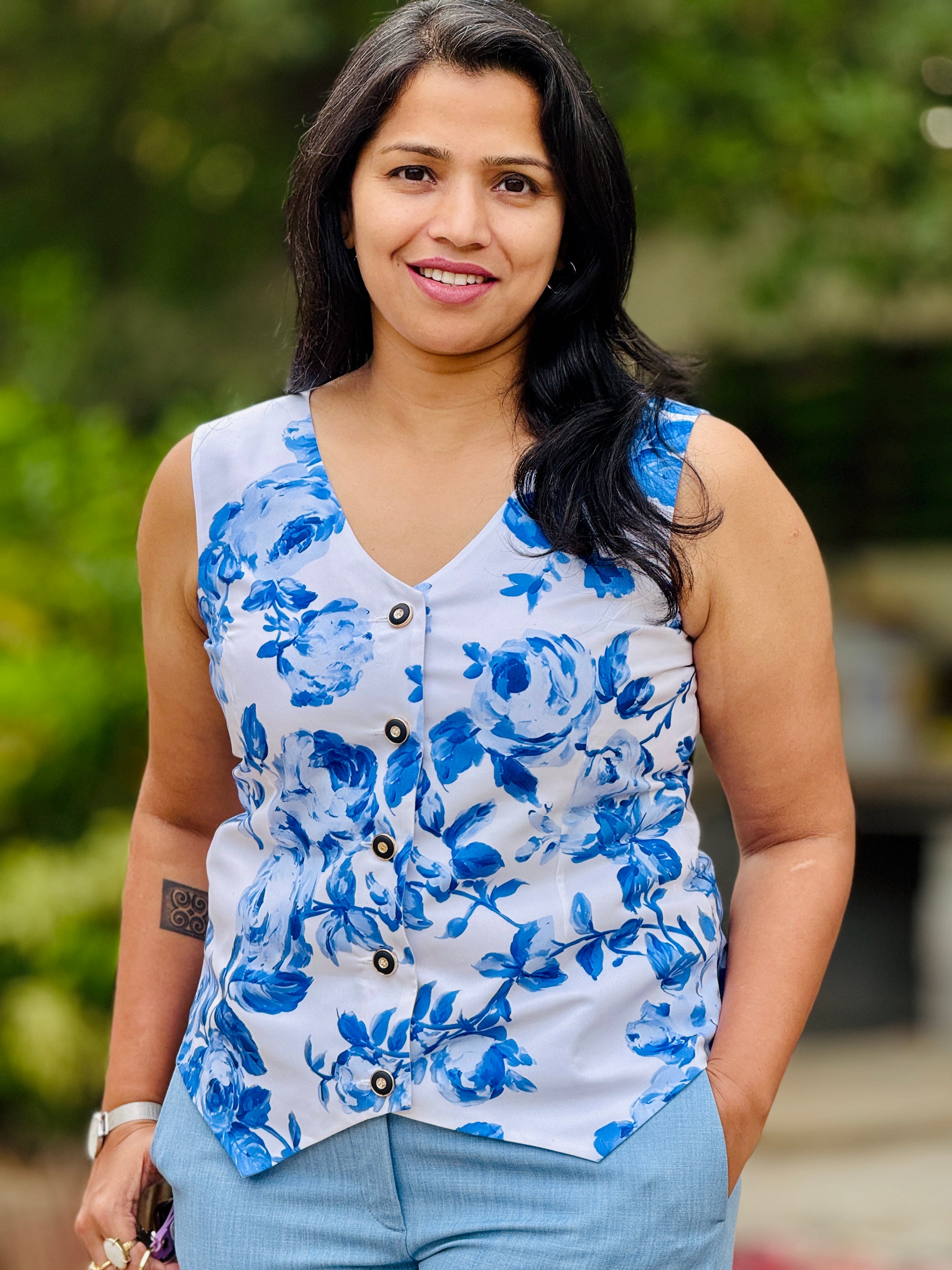 Women’s White & Blue Waistcoat – Premium Cotton Vest with Florals