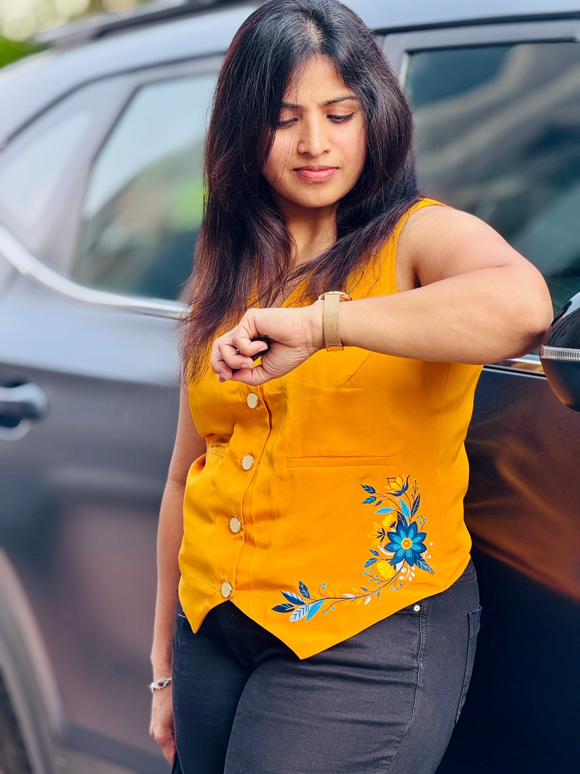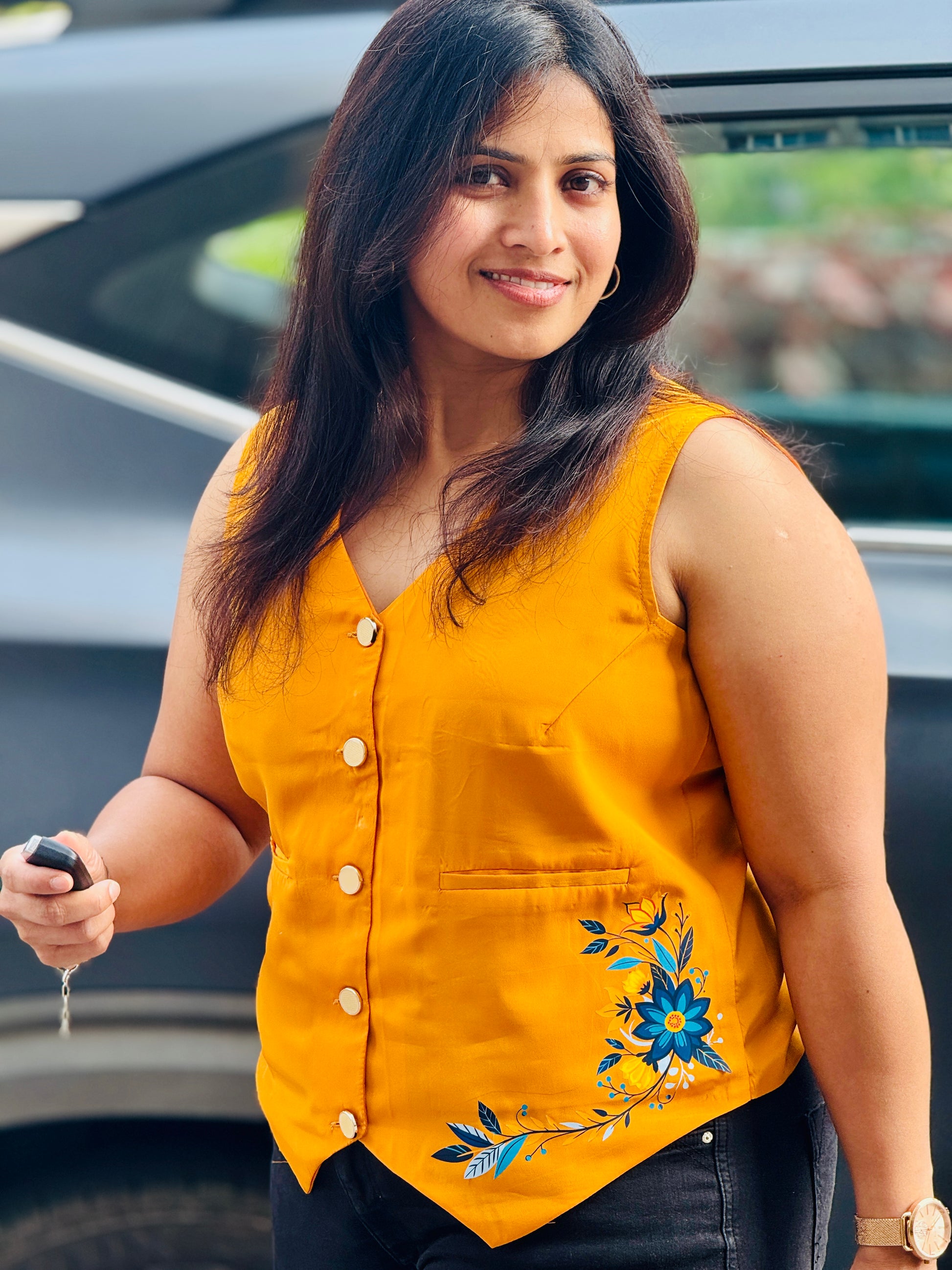 Women’s French Crepe Waistcoat – Tangerine Orange , Printed Vest